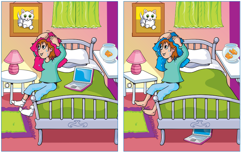 Look at these pictures. They look the same, but some things are different. Here there is one fish, but here there are two.
