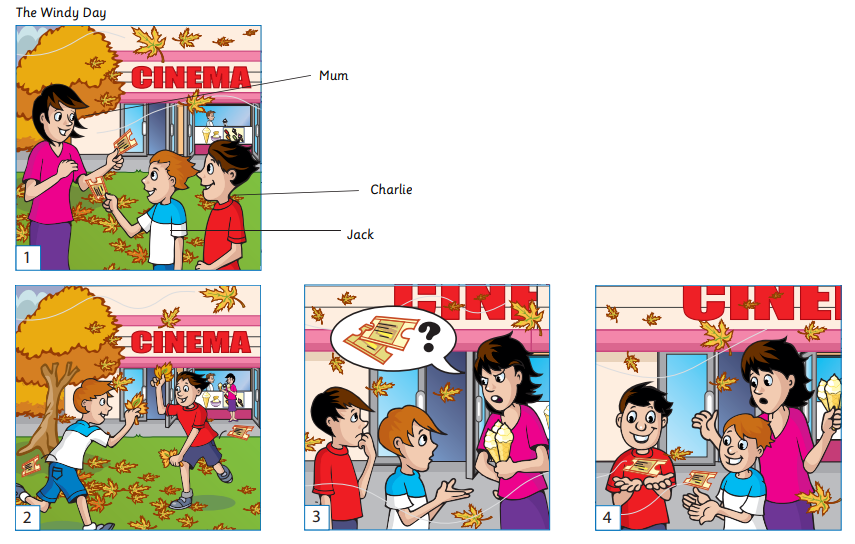 It's a windy day. Charlie and Jack are going to the cinema with Mum. Mum is giving them their tickets. She is saying "Don't lose your tickets!"