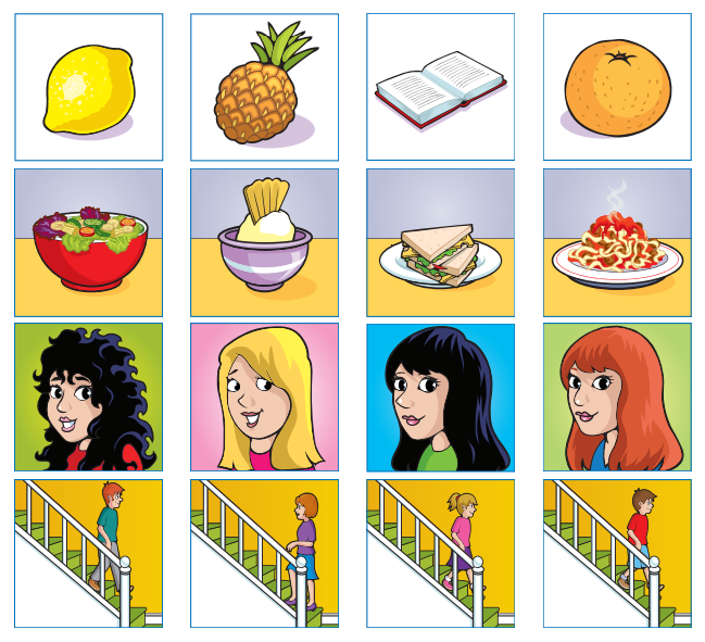 Now look at these four pictures. This one is different. The book is different. A lemon, an orange and a pinapple are fruit. You eat them. You don’t eat a book. You read it.