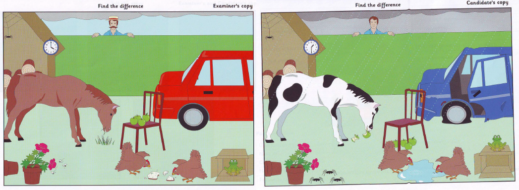 3. Now here are two pictures. My picture is nearly the same as yours, but some things are different. For example, the car in my picture is red, but in your picture it's blue. OK?